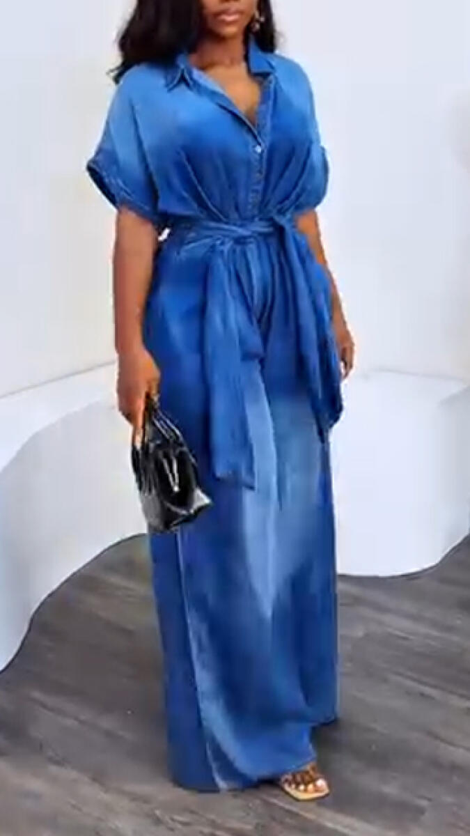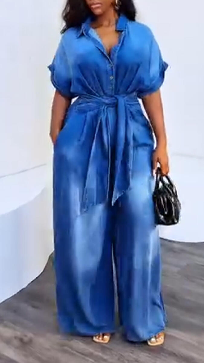 Women Collar Wash Water Temperament Casual Denim Jumpsuit