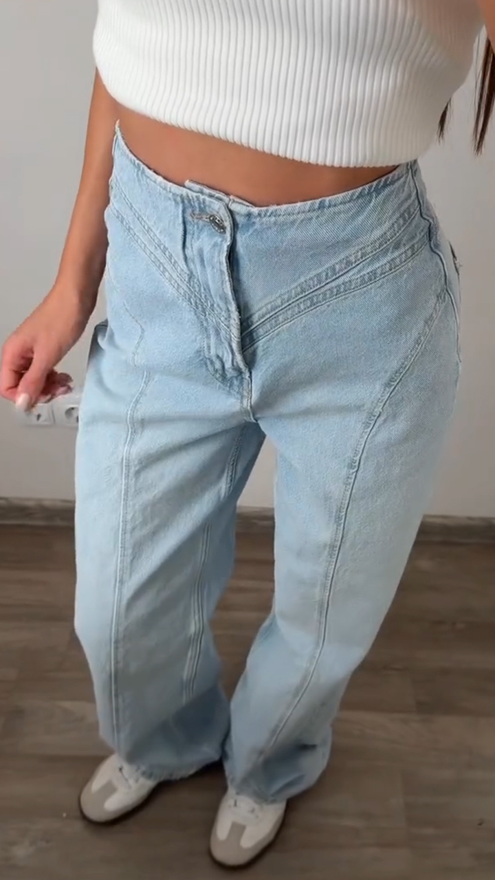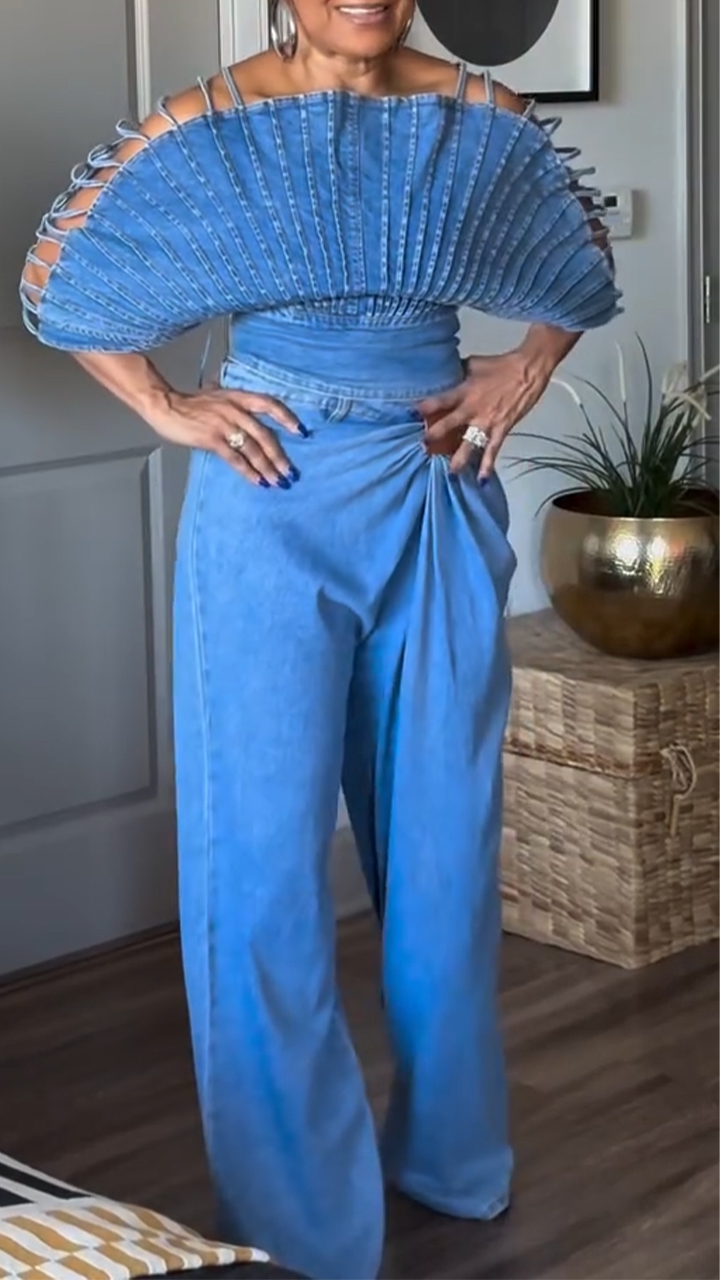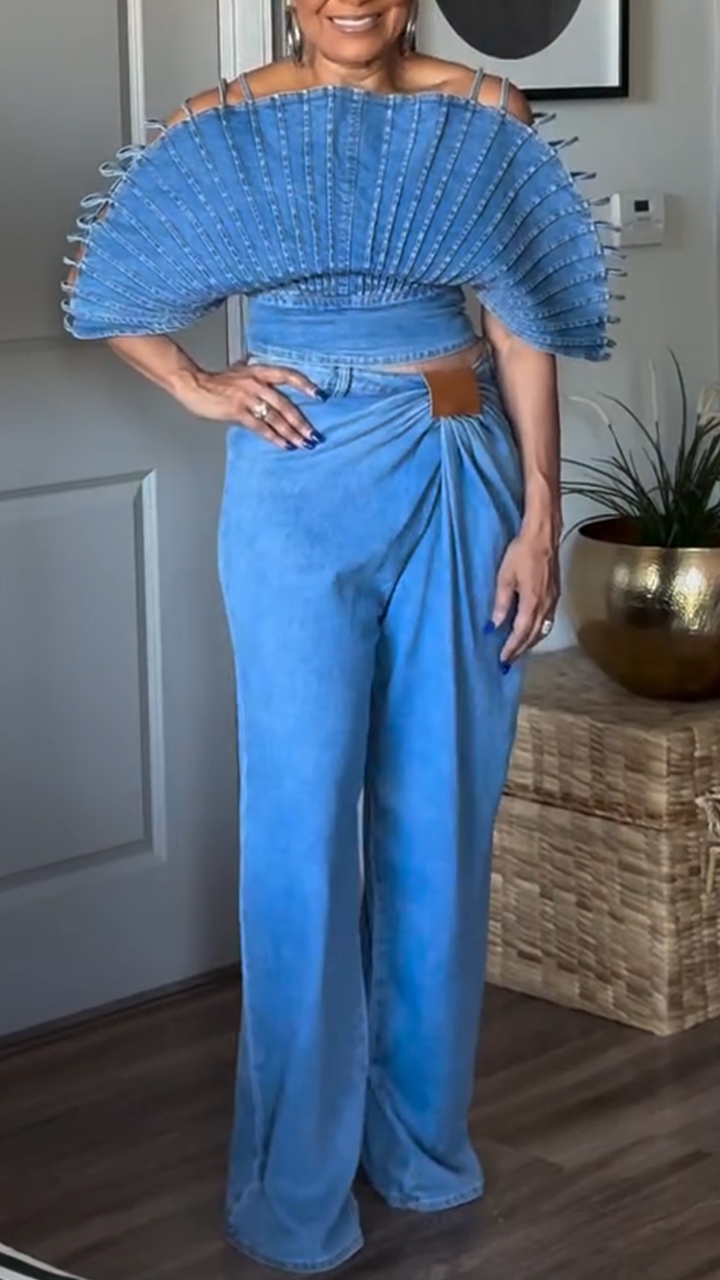 Women Camisole Fan-shaped Top + Pants Casual Denim Set