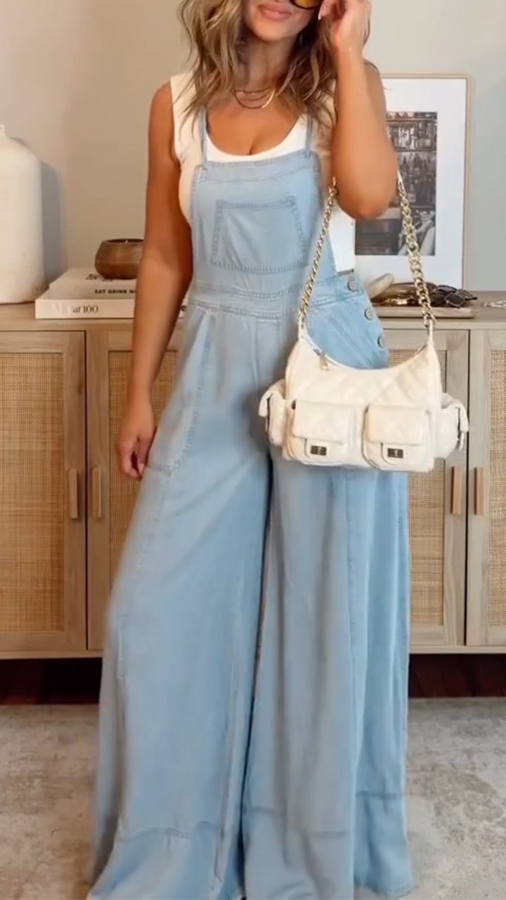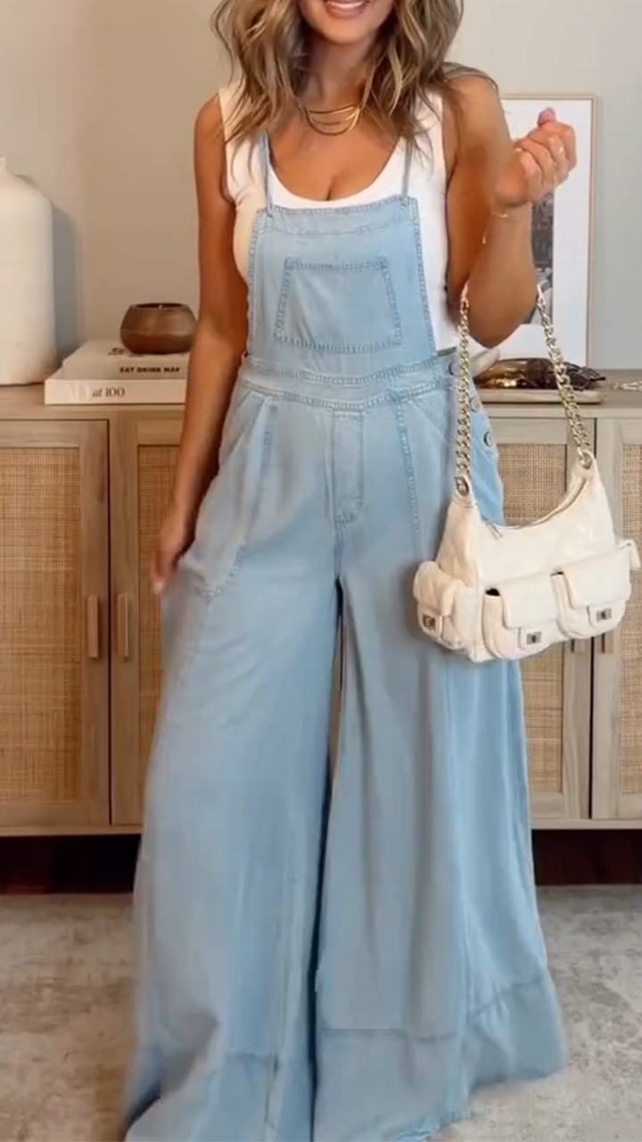 Women Spaghetti Strap Patchwork Casual Wide Leg Denim Jumpsuit