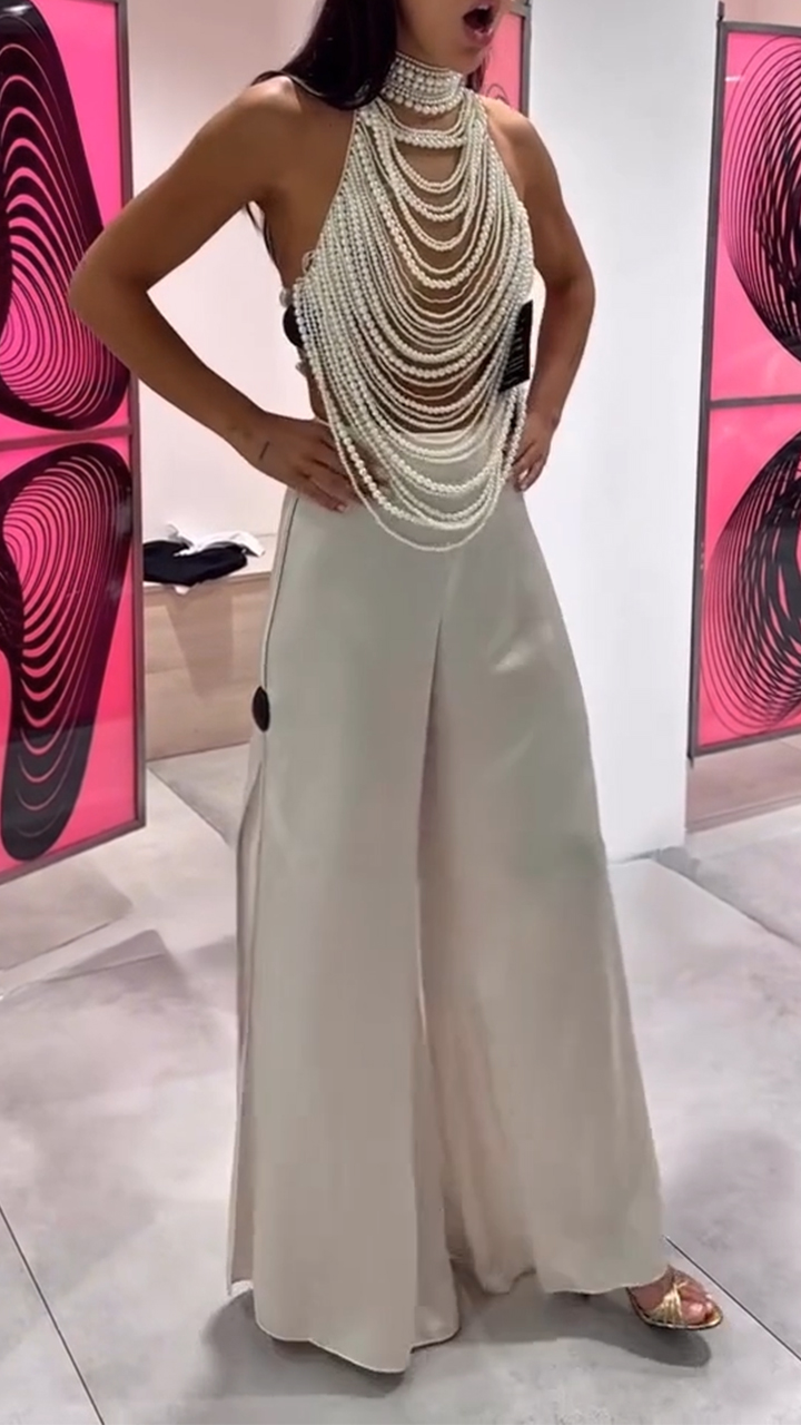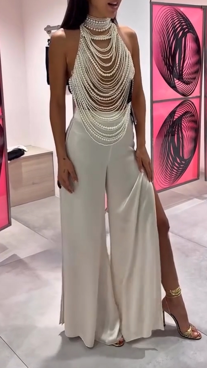 Women Off Shoulder Pearl Chain Neck Hanging Top + Slit Pants Sexy Temperament Set