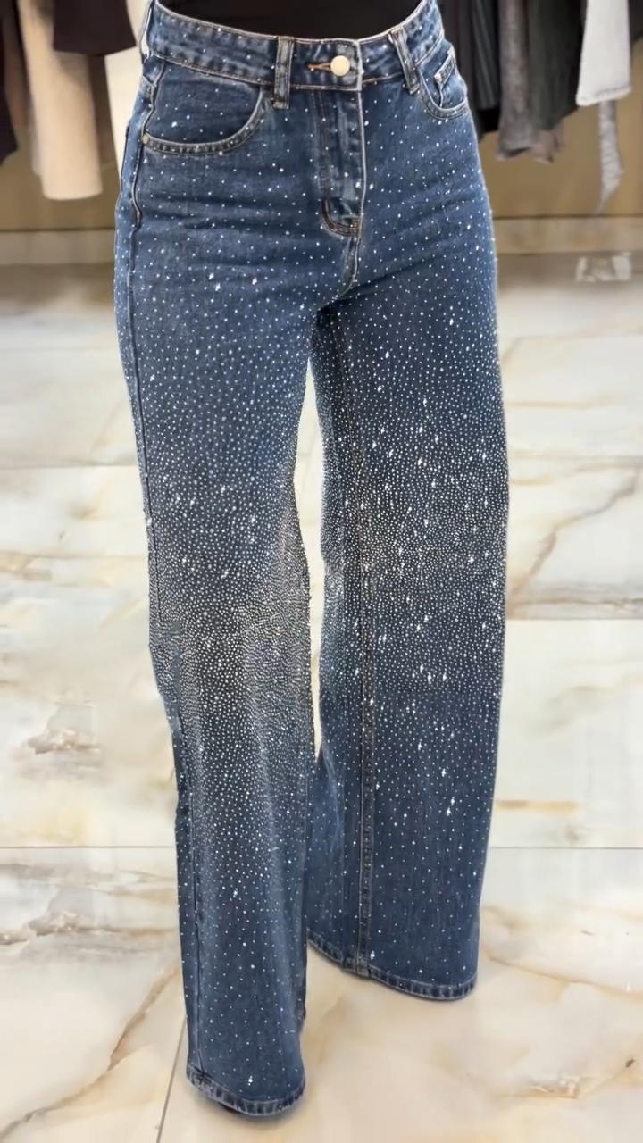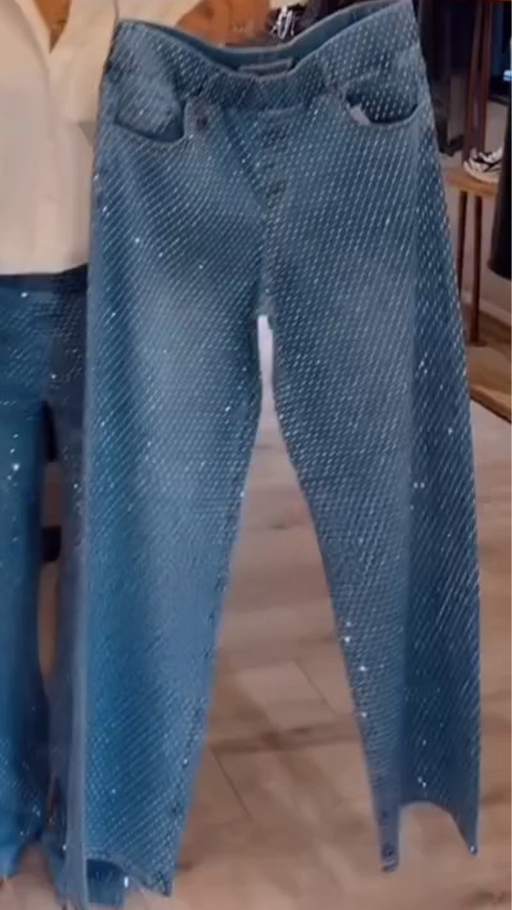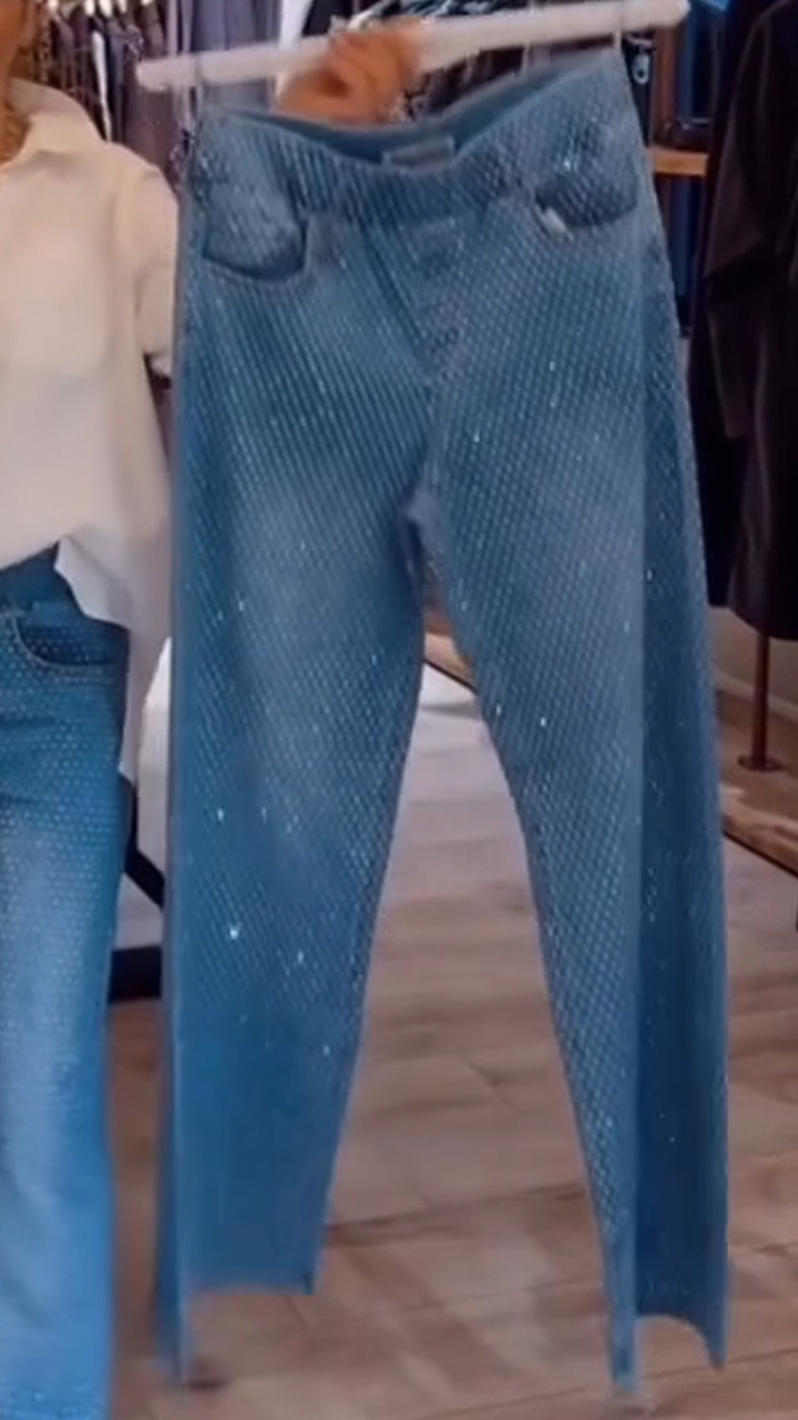 Women Round Neck Rhinestone Top+ Jeans Casual Set