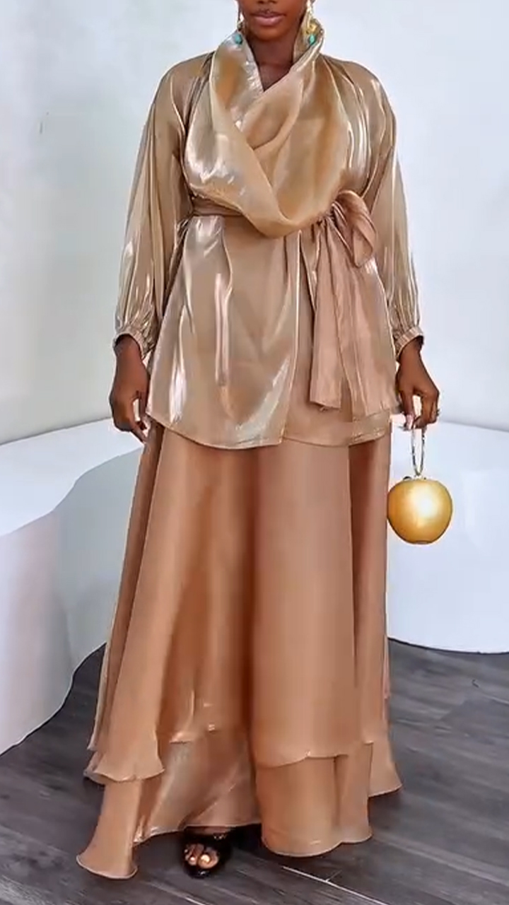Women Round Neck Top+ Pleated Pants Shiny and Temperament Casual Suit