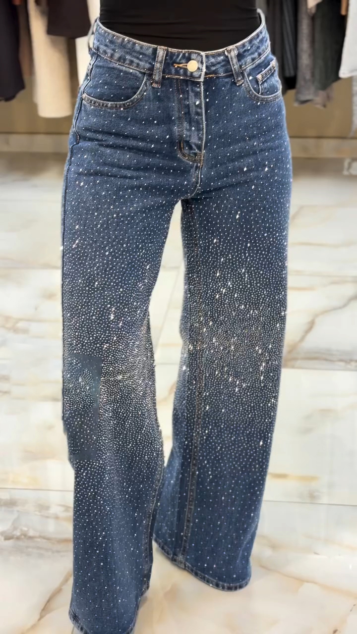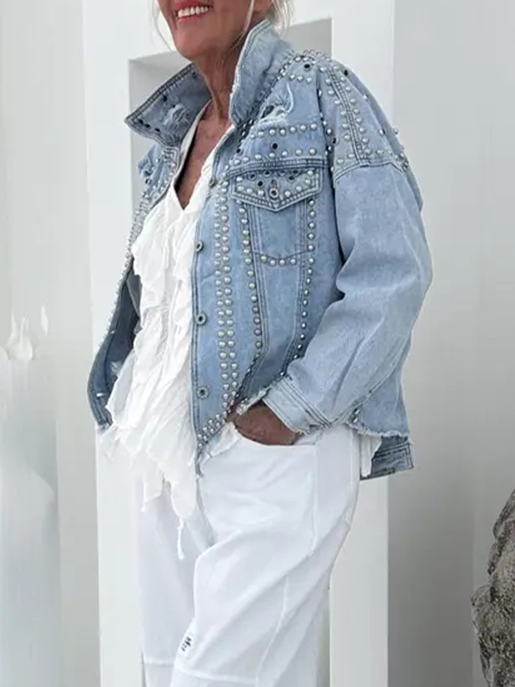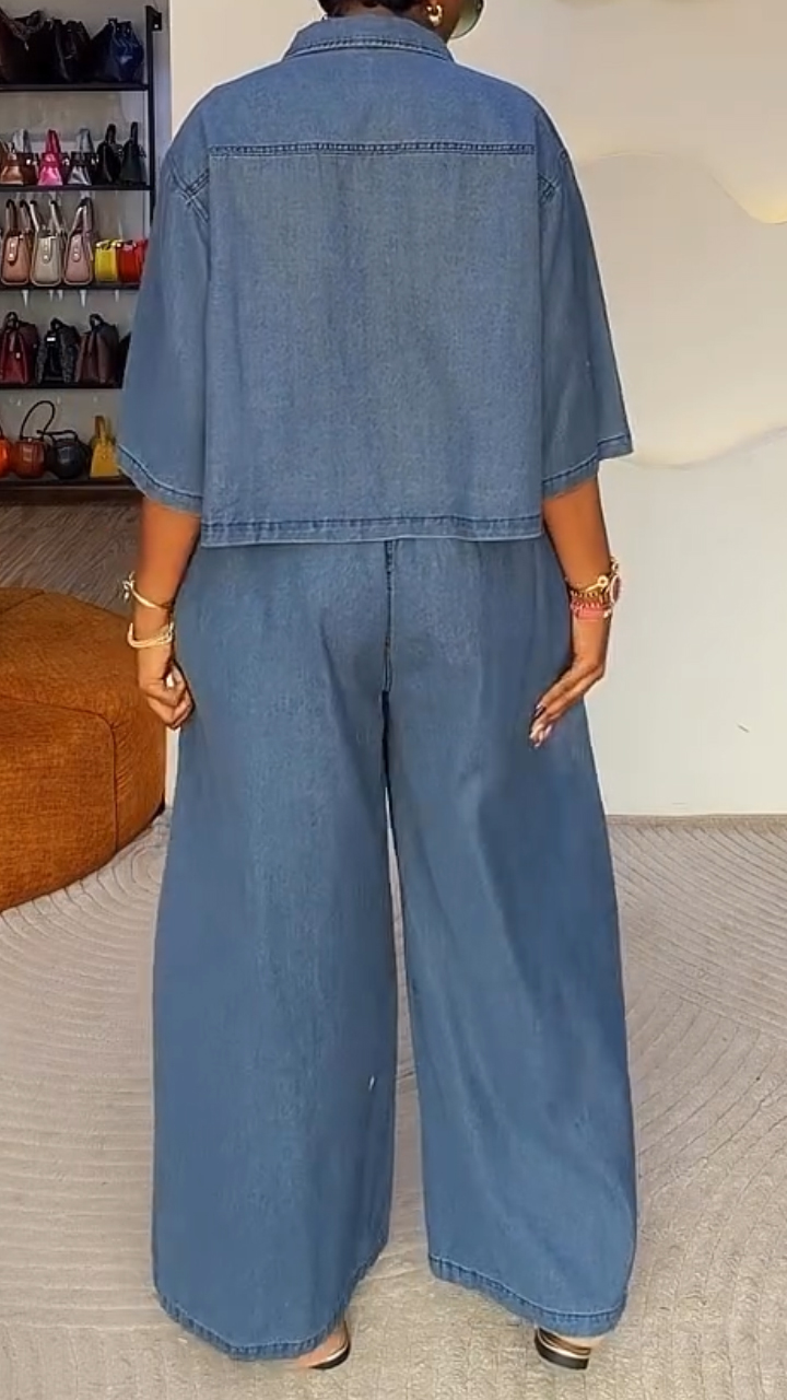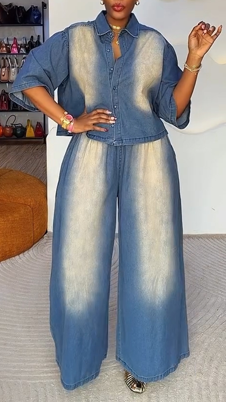 Women Collar Shirt + Rhinestone Jeans Casual Set