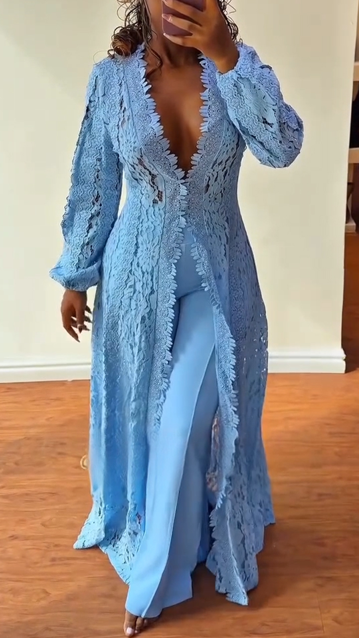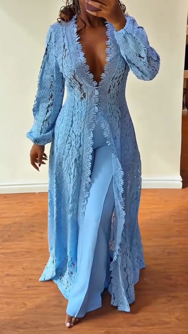 Women Long Lace Cardigan + Trousers Solid Color Casual Suit