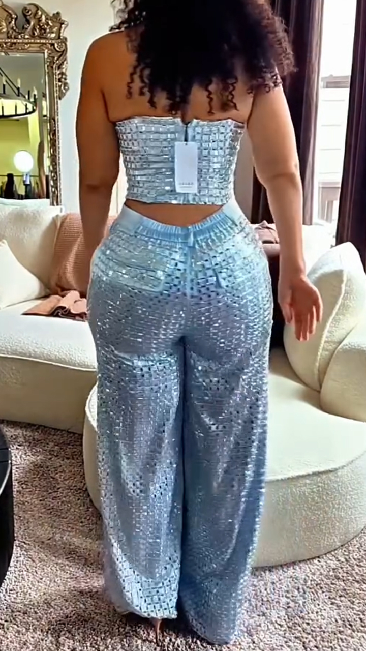 Women Round Neck Rhinestone Top+ Pants Casual Set