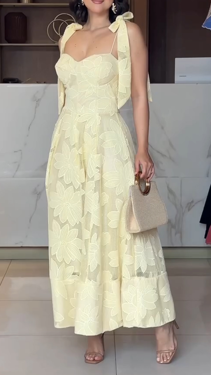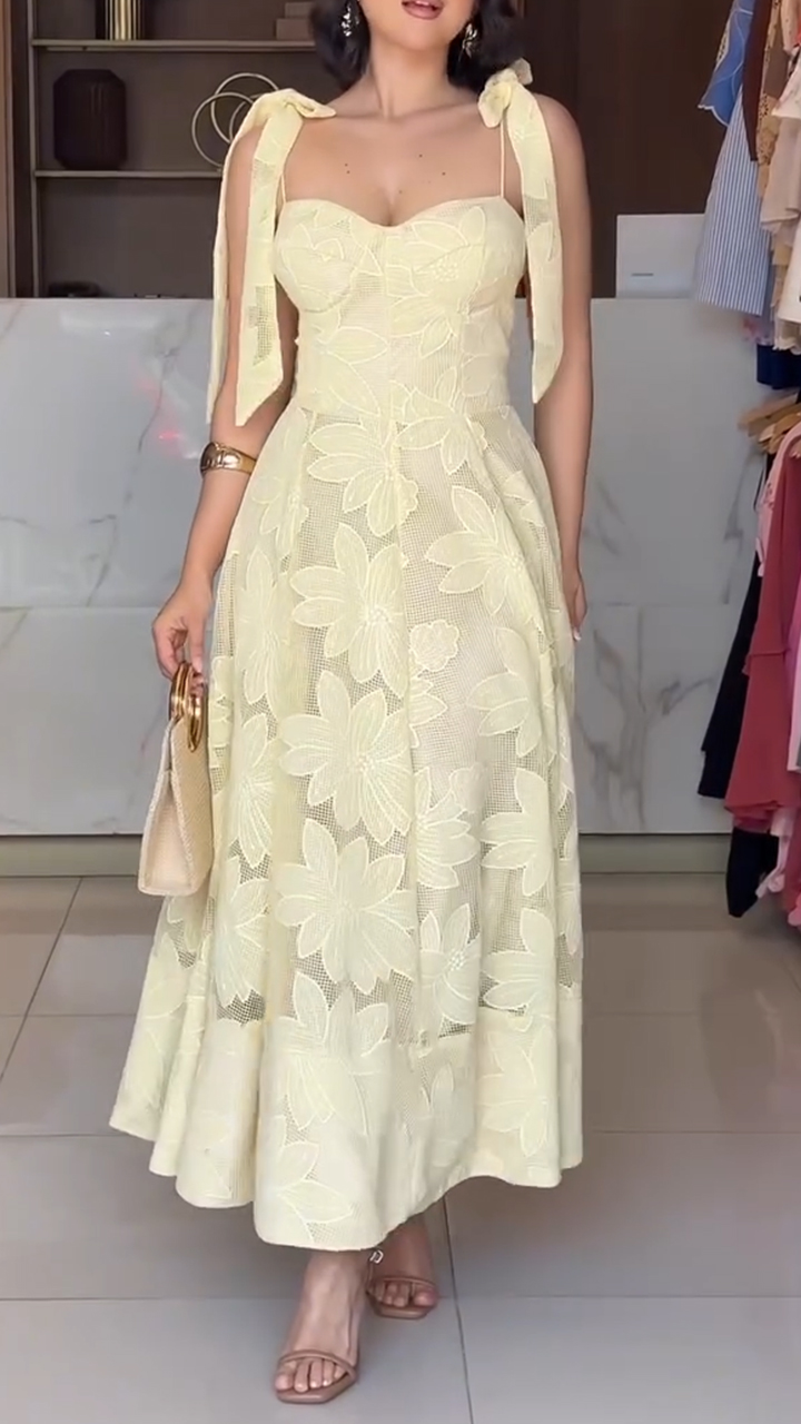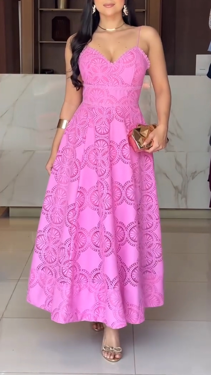 Women Round Neck Printed Hollow Out Elegant Temperament Dress