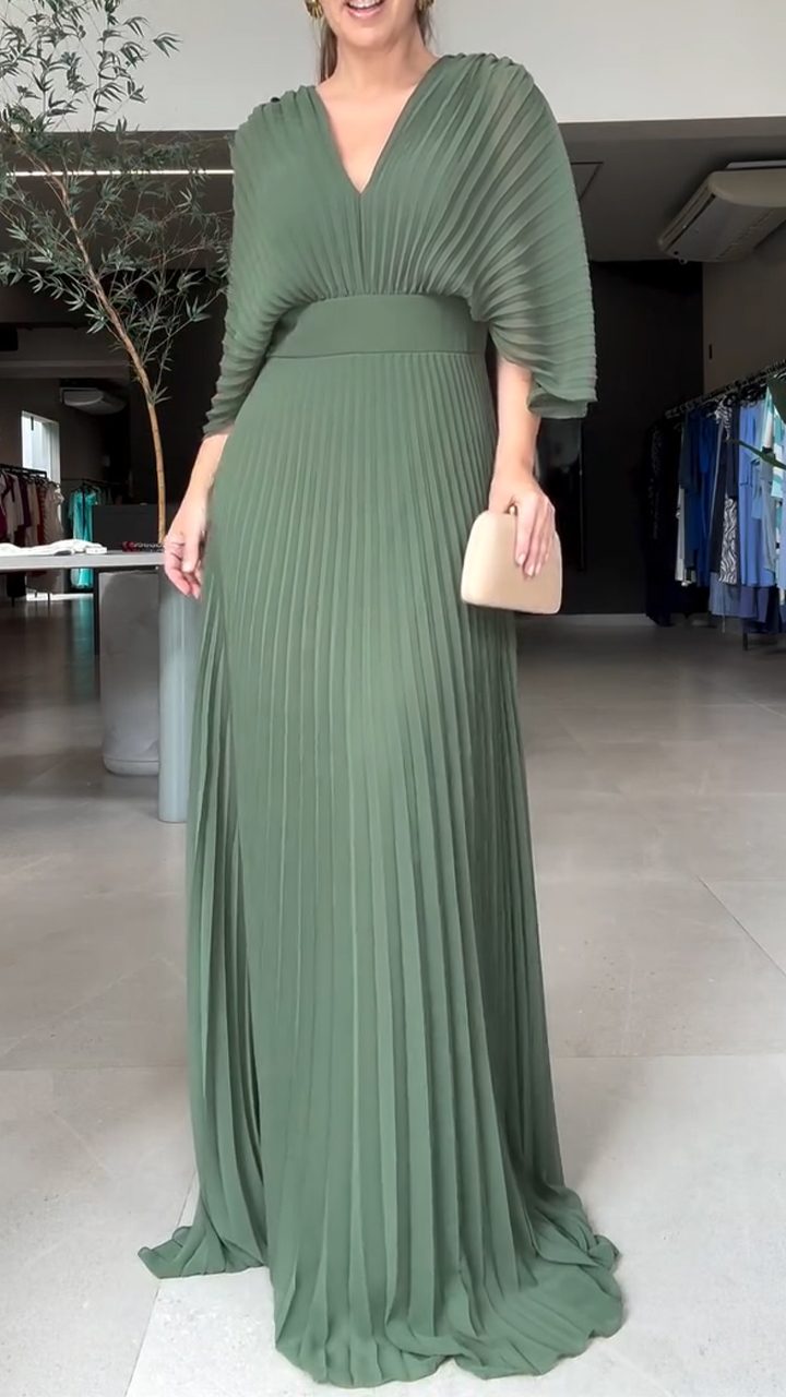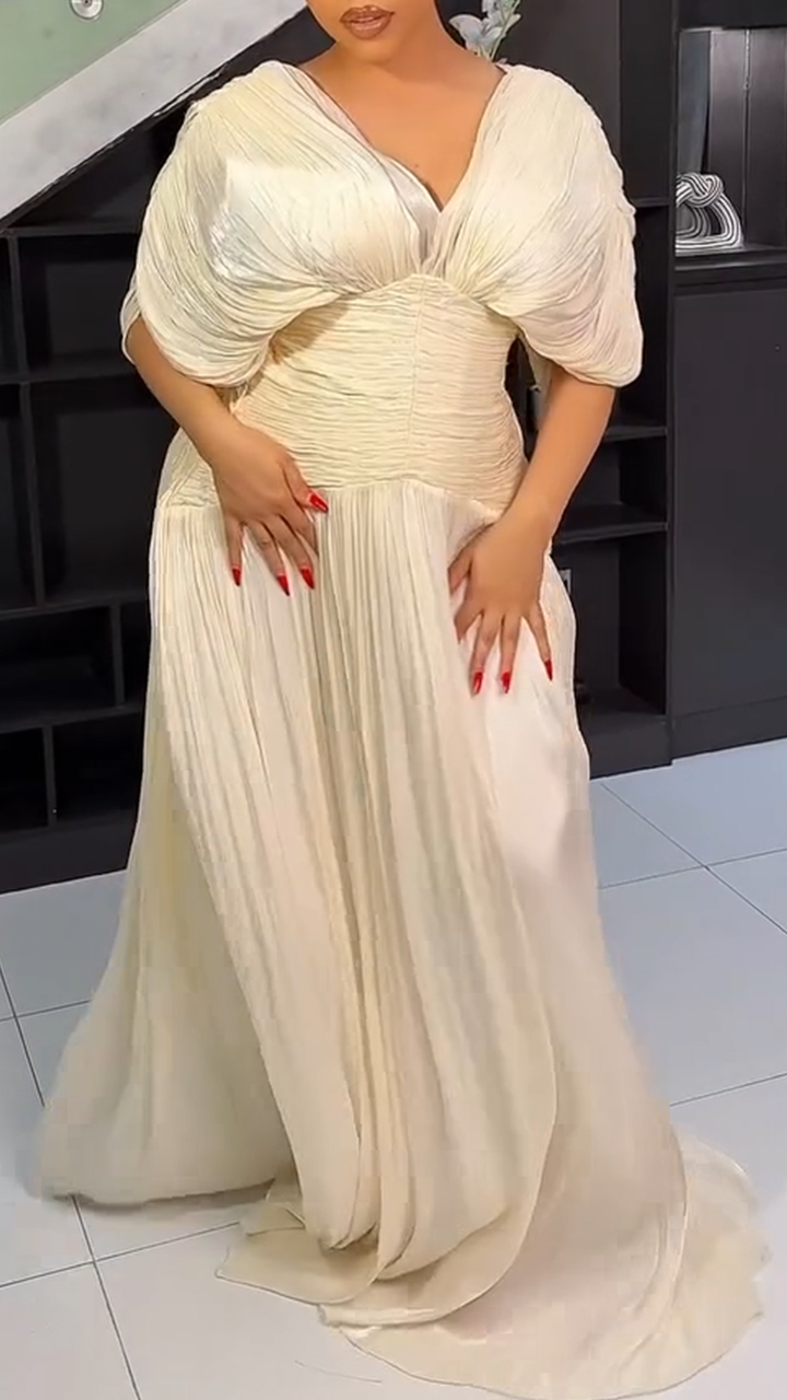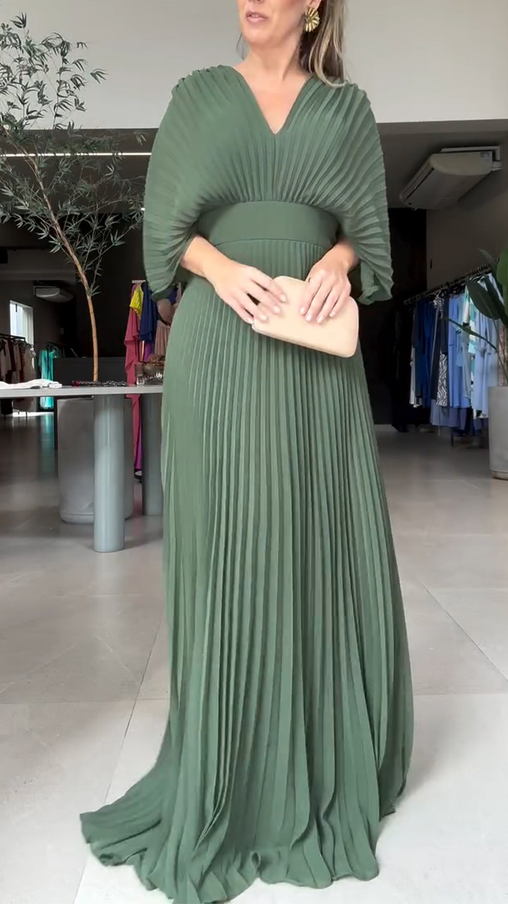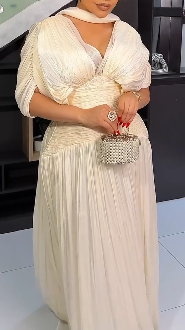 Women V-neck Patchwork Pleated Solid Color Elegant Temperament Dress