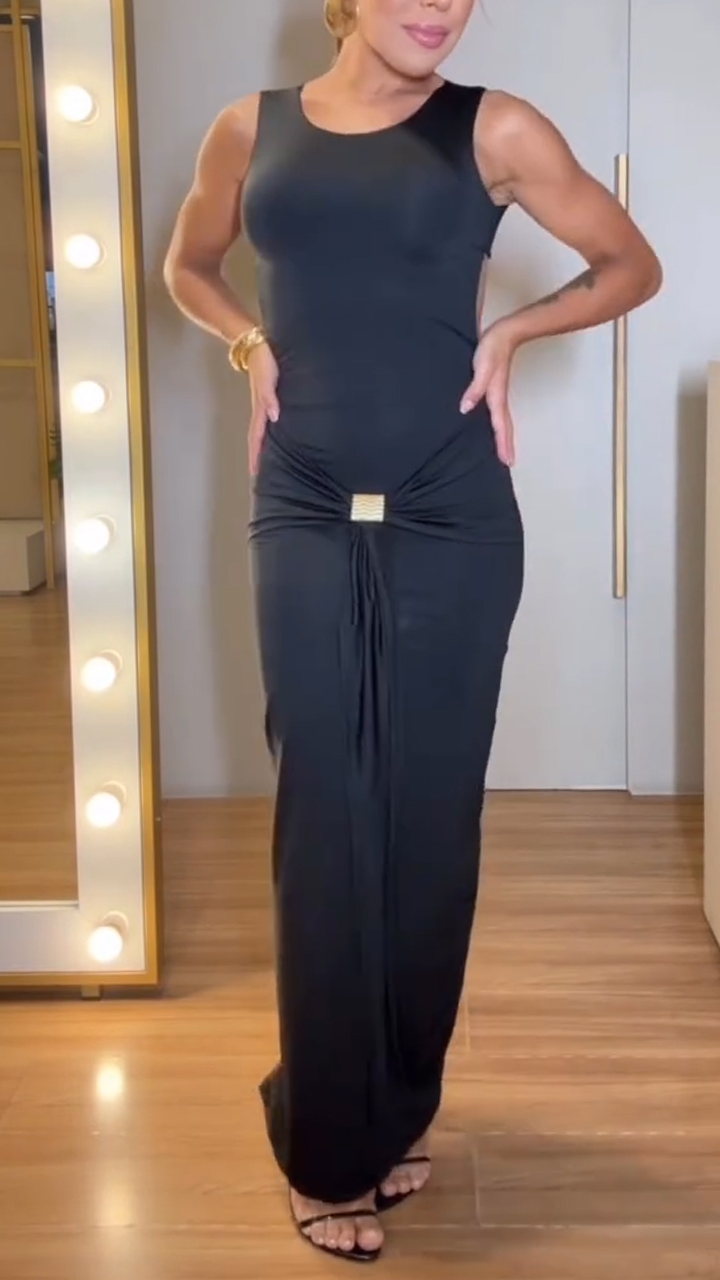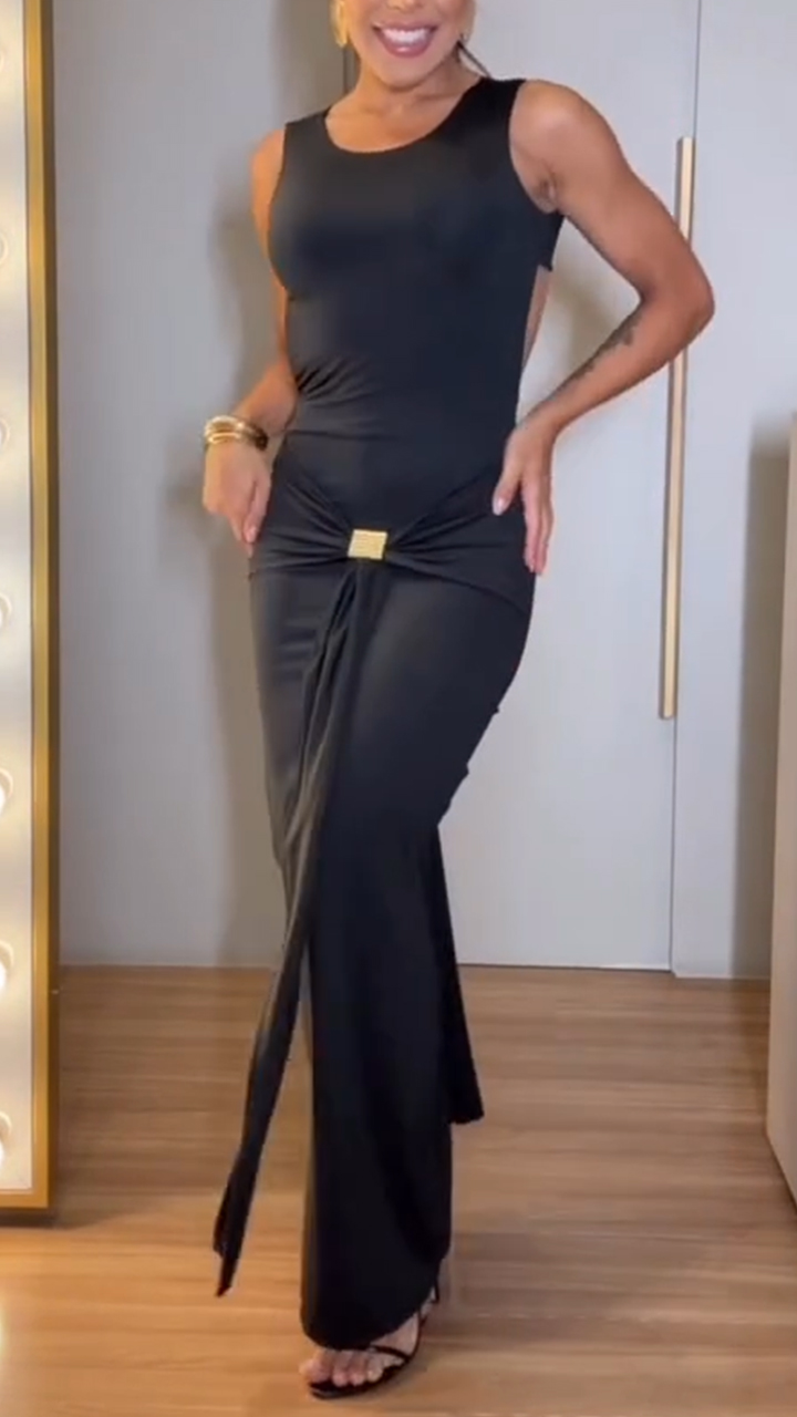 Women Round Neck Hollow Slit Solid Color Elegant Temperament Dress
