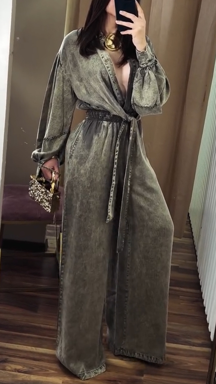 Womens Deep V-neck Retro Casual Denim Jumpsuit