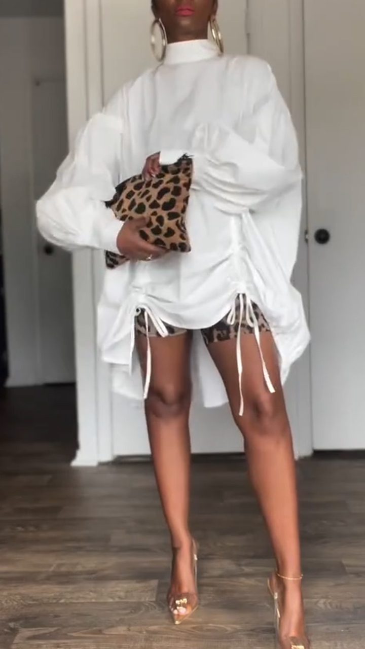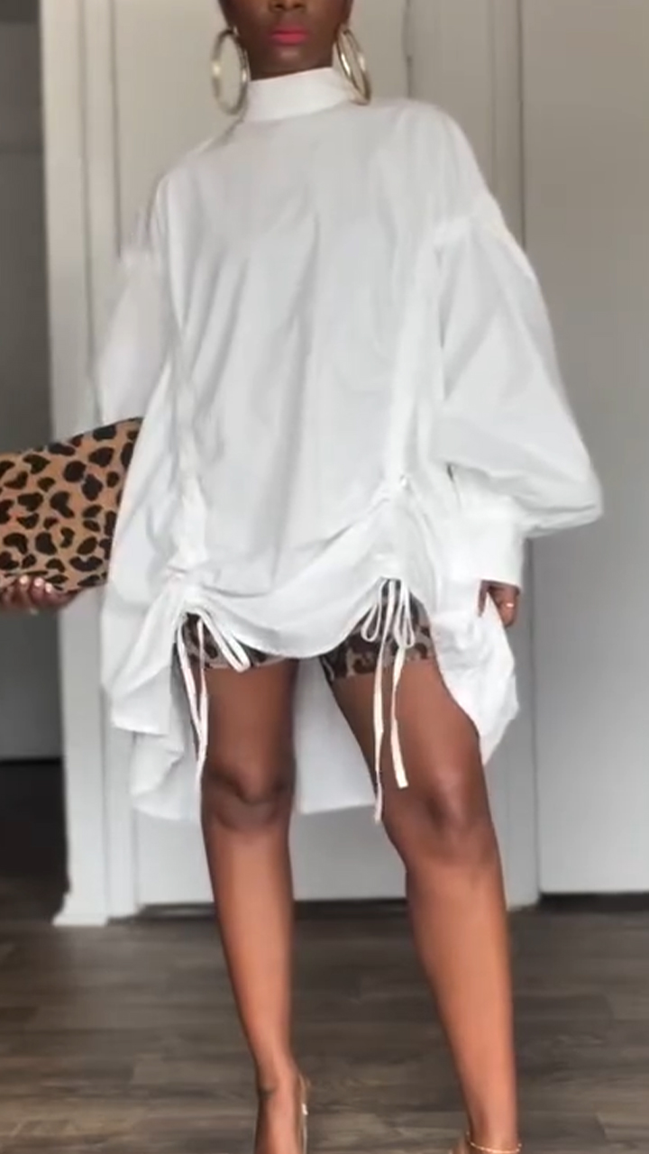Womens Round Neck Drawstring Solid Color Irregular Casual Top