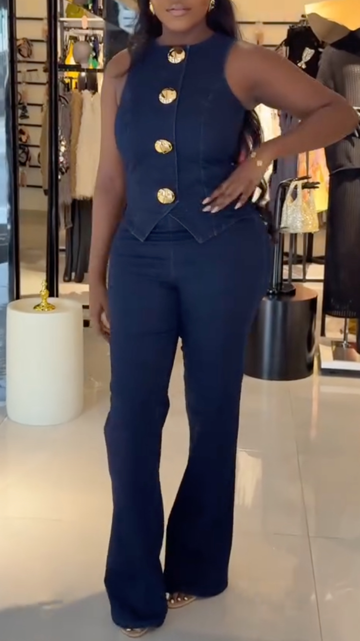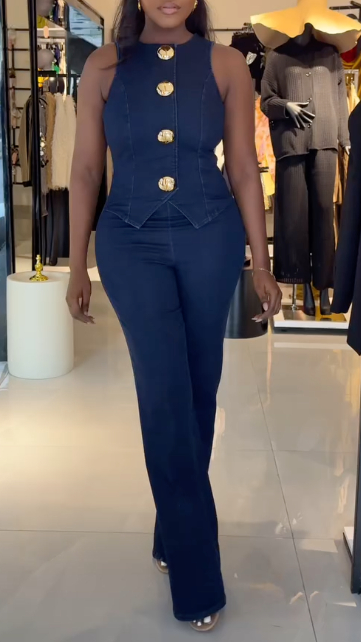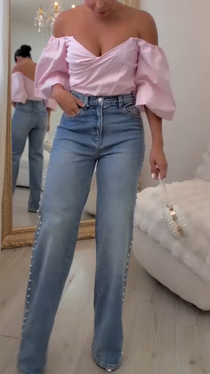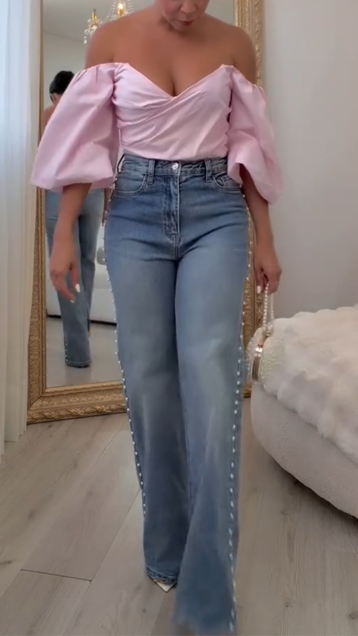 Women One Neck Top + Nail Bead Washed Denim Jeans Sexy Casual Suit