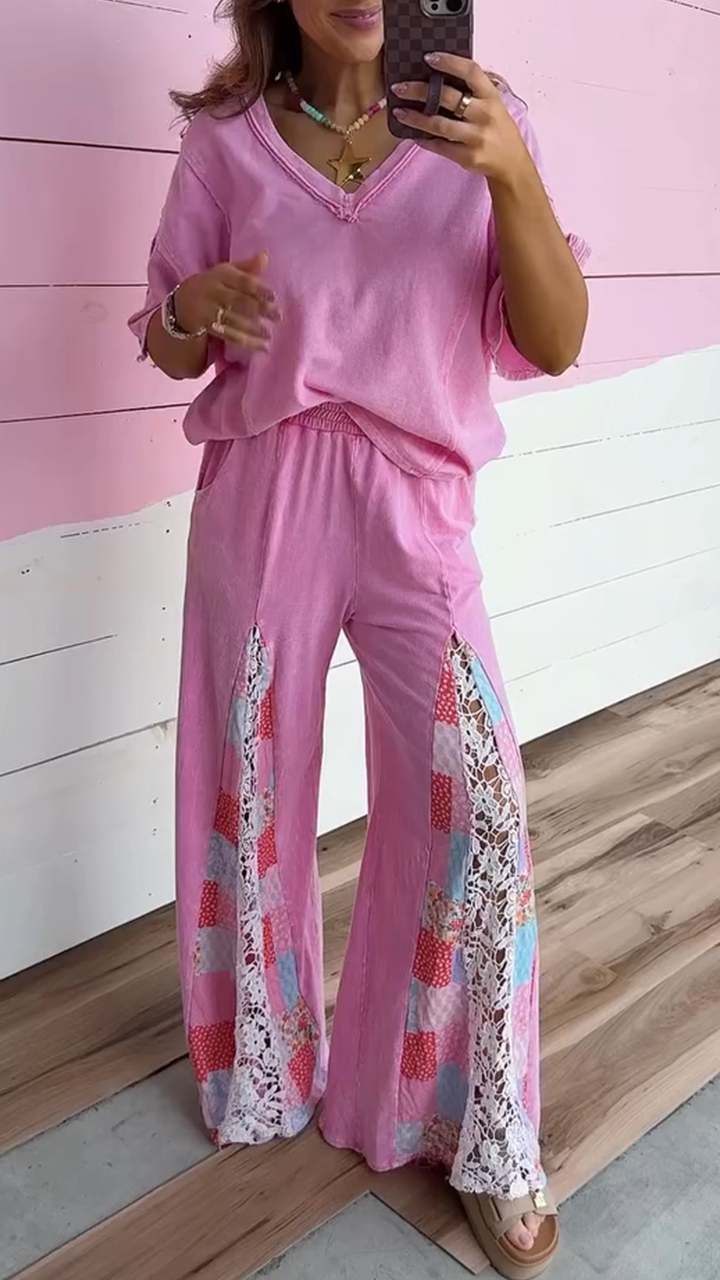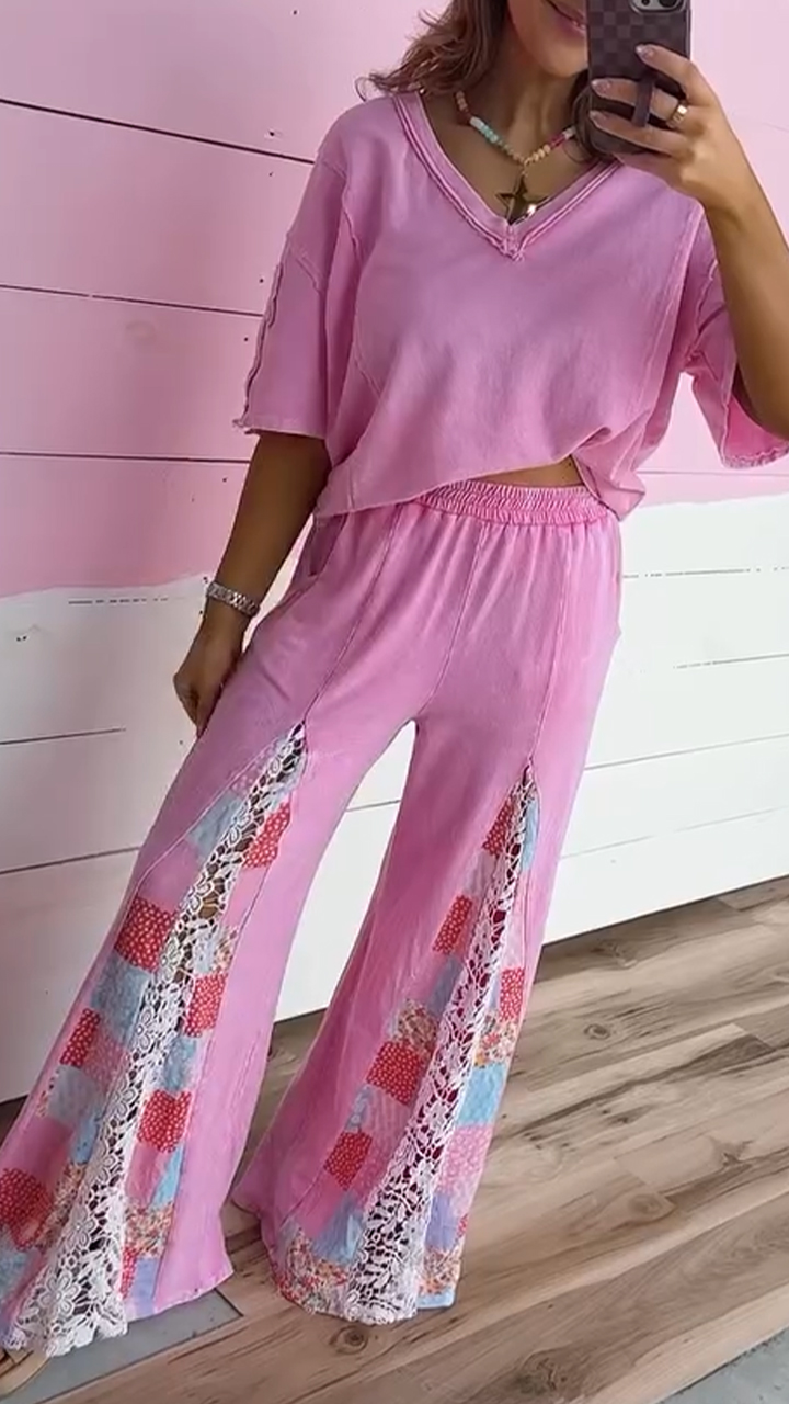 Women V-neck Top + Splicing Lace Printed Casual Set