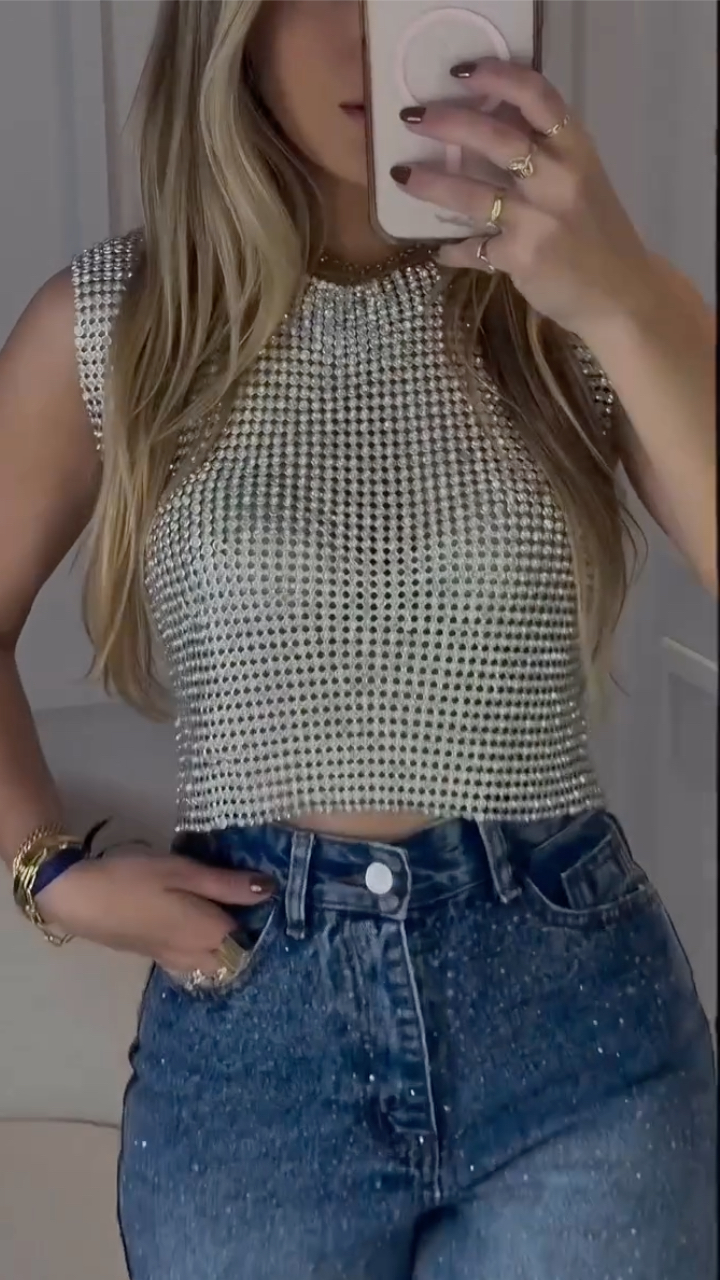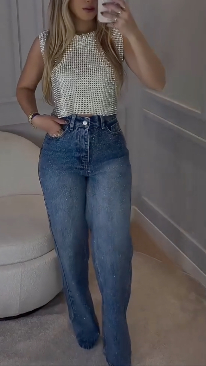 Women One Neck Top + Nail Bead Washed Denim Jeans Sexy Casual Suit
