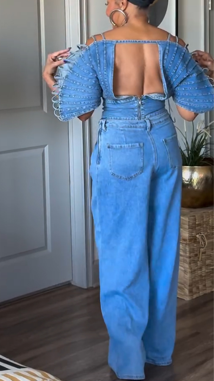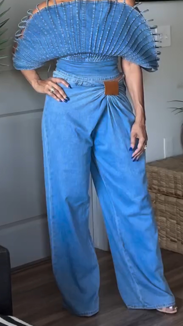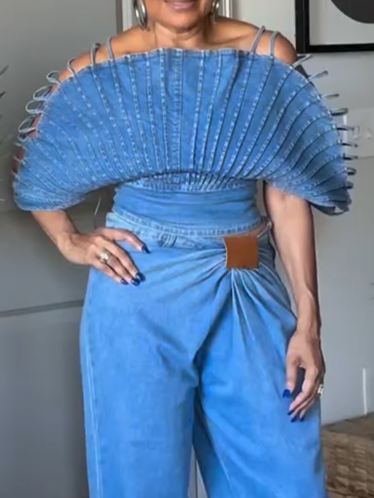 Women Camisole Fan-shaped Top + Pants Casual Denim Set