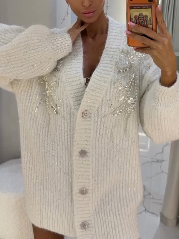 Womens Pearl Decorated Casual Knitted Cardigan
